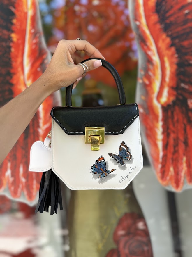 Discover the charm of this dynamic Iconic Mini handbag, crafted from real smooth white leather, featuring real smooth black leather front flap. A removeable and adjustable cross-body strap, and our signature tassel and heART-shaped bag jewel. Adorned with hand-painted dark blue butterflies, this bag combines modern and romantic aesthetics with artistry.